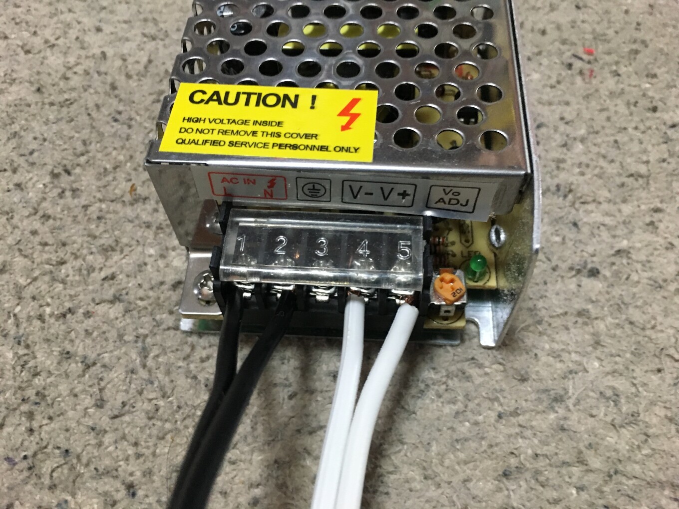 とりあえず、結線していく。左の2つの端子は、ACのコンセントからやってくる2本の線をつなぎまして、こんな感じ。当然反対側はコンセントプラグです。このケーブルの調達先は壊れた家電のものをチョッキンです。